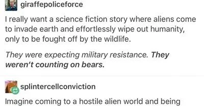 My first reaction to reading that was to laugh, and then I moved onto the next funny thing Pinterest had for me. Only, months later, this concept popped into my head, again. An alien invasion gone wrong because of something they just couldn’t predict and plan for? That…That sounds like it could be turned into a story, don’t you think?